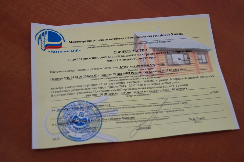 В Хакасии программа улучшения жилищных условий граждан, проживающих в сельской местности, в том числе молодых семей и молодых специалистов действует с 2006 года. Социальная выплата от государства предусматривает получение 70 процентов от стоимости приобретаемой квартиры или сметы на строительство дома. Еще 30 процентов стоимости жилья вносит непосредственно соискатель выплаты.
