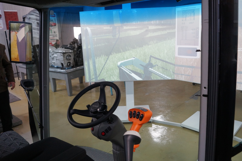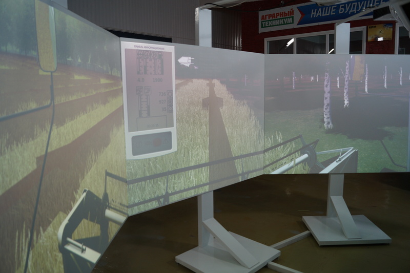 Новый тренажер полностью повторяет кабину комбайна «Вектор», перед которой полукругом установлены экраны, имитирующие часть поля. С помощью компьютерной программы студенты могут убирать виртуальный урожай.